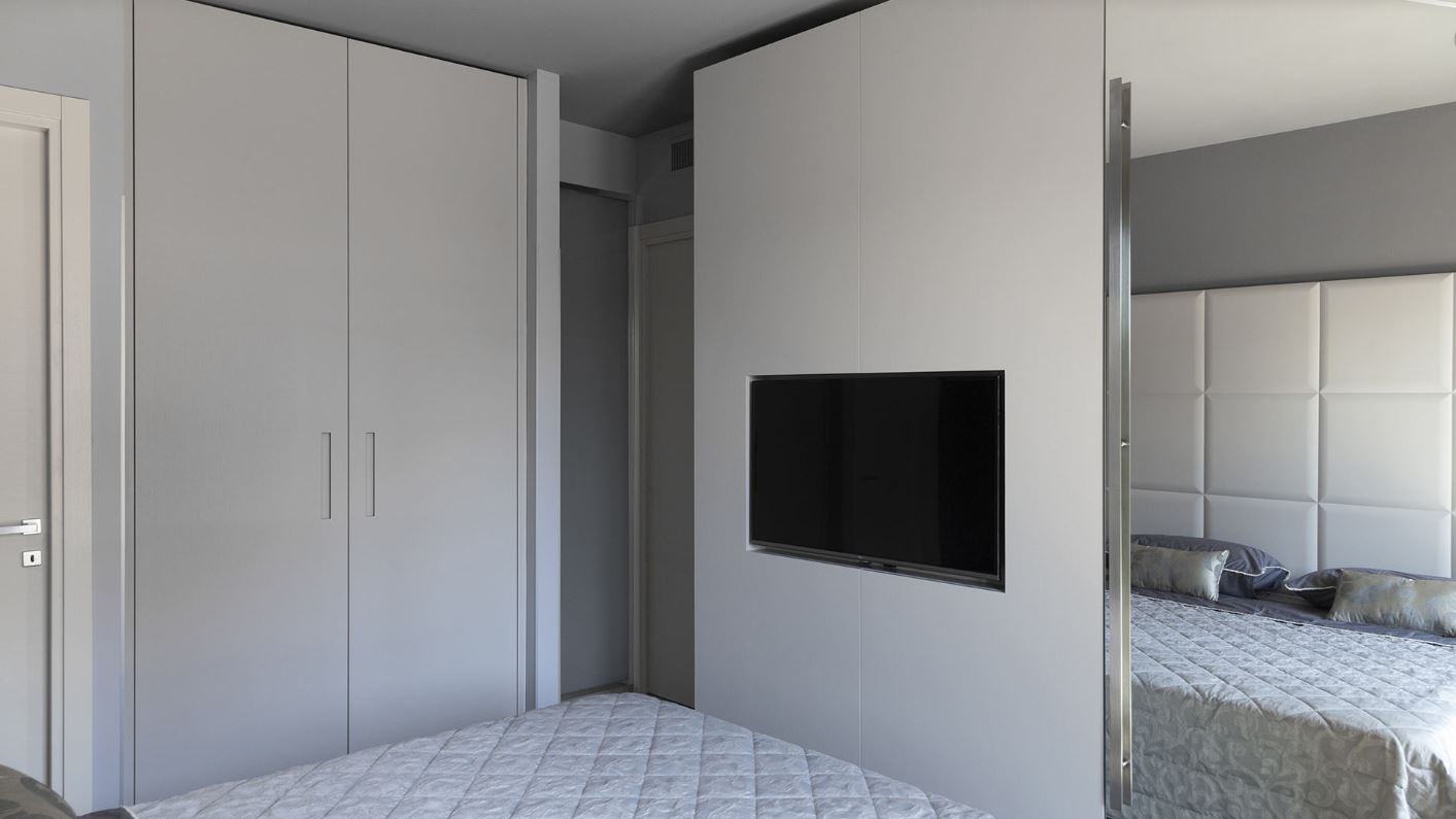 Dans le penthouse de cette prestigieuse résidence, la cuisine, le salon et les chambres ont été aménagés. La cuisine a été réalisée sur le modèle D90, une composition d’angle avec une péninsule donnant sur le séjour, parfaite pour recevoir des invités et maintenir la fluidité des espaces. La finition des portes des meubles bas et hauts est en chêne flammé à 45° caractéristique, un procédé spécial de travail du bois qui confère de l’élégance à l’ensemble de la création. L’effet « épine » unique donné par le teck miroité à 45° confère un caractère unique à cet appartement avec vue sur la mer. Les meubles hauts à ouverture push&pull ont des portes laquées gris alpaga, tandis que le plan de travail est en grès arabesque avec évier intégré. La composition est complétée par des poignées Miuccia en bronze antique, assorties à la robinetterie. Les finitions de la cuisine ont également été reprises sur le meuble TV, qui présente un cadre en chêne teinté frêne, un socle en bronze antique et des portes laquées gris alpaga brillant. Dans les autres espaces de vie et de nuit, les meubles encastrés, les penderies, les tables de chevet et les têtes de lit ont été réalisés dans des tons gris, beige et blanc.