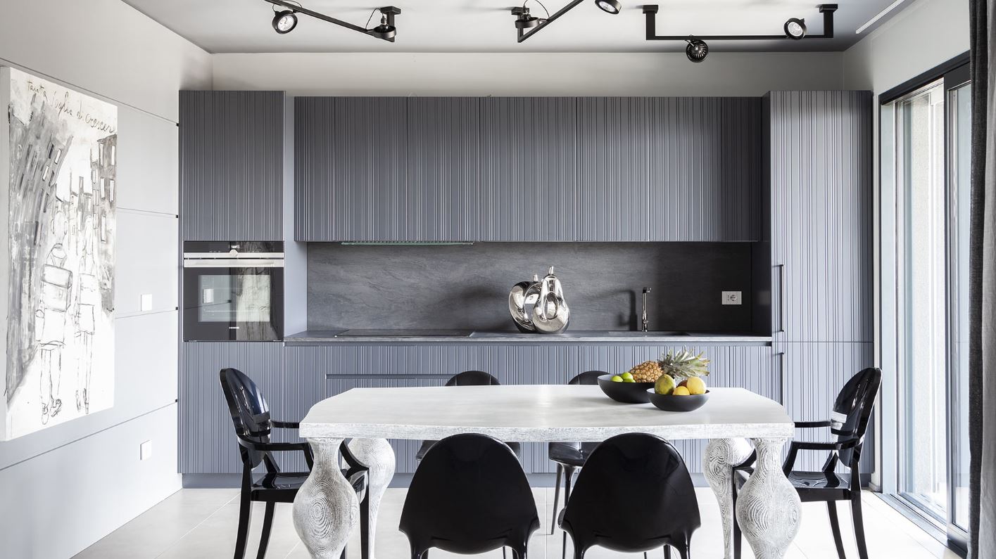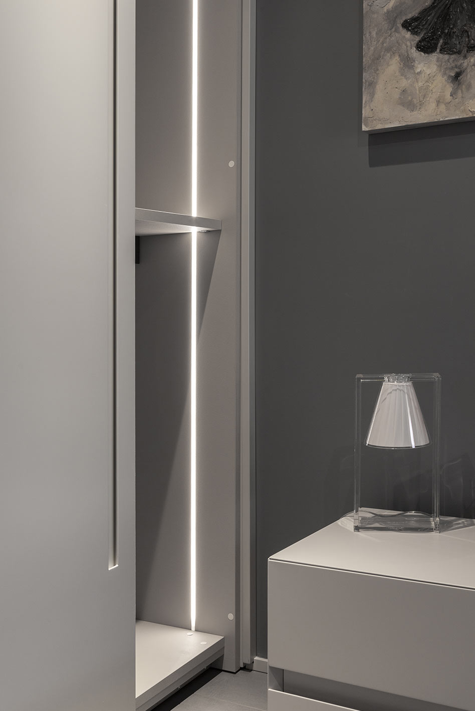 Le deuxième appartement dispose d’un espace de vie ouvert caractérisé par des couleurs sombres et audacieuses. La cuisine Rua, avec ses façades laquées grises combinées au plan de travail en grès Ardoise Noire, est disposée de manière linéaire dans un espace ouvert et lumineux donnant sur la mer. Le meuble de vie tout en hauteur intègre les colonnes porteuses et permet de séparer le coin bureau de l’espace de divertissement. Les meubles sont équipés de portes et de compartiments ouverts. Les tons gris servent de fil conducteur entre toutes les pièces, du salon à la chambre à coucher. Le boiserie s’étend du salon au couloir et cache discrètement la porte de la buanderie et de la lingerie. Le coin nuit est équipé d’armoires, de penderies, de tables de chevet et de têtes de lit.