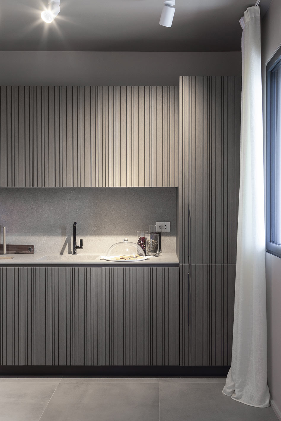Le troisième appartement est habité par une jeune famille qui a préféré séparer les espaces par fonction. La cuisine du modèle Rua présente des façades en chêne fumé sur fond noir, associées à un plan de travail et à un dosseret en grès ivoire avec évier intégré. La composition d’angle est partiellement dissimulée du reste de l’espace de vie pour créer des environnements idéalement bien séparés, bien qu’en continuité les uns avec les autres. La salle à manger est équipée d’une bibliothèque sur mesure et de portes coulissantes en verre. Les nuances de gris et de beige se succèdent dans tout le mobilier, créant une atmosphère harmonieuse et élégante. L’espace nuit est équipé d’armoires, de penderies, de tables de chevet et de têtes de lit.